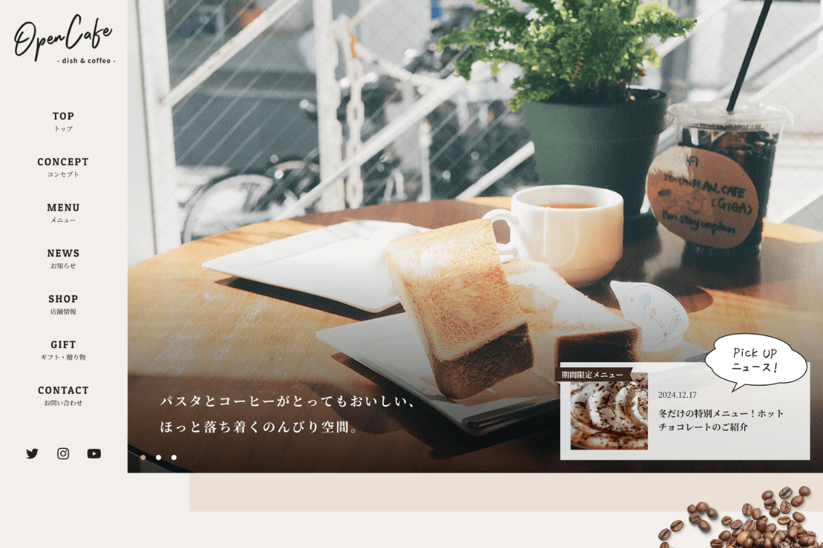 スクールの卒業制作課題として、カフェ『Open Cafe』のホームページをWordPressで実装しました。
